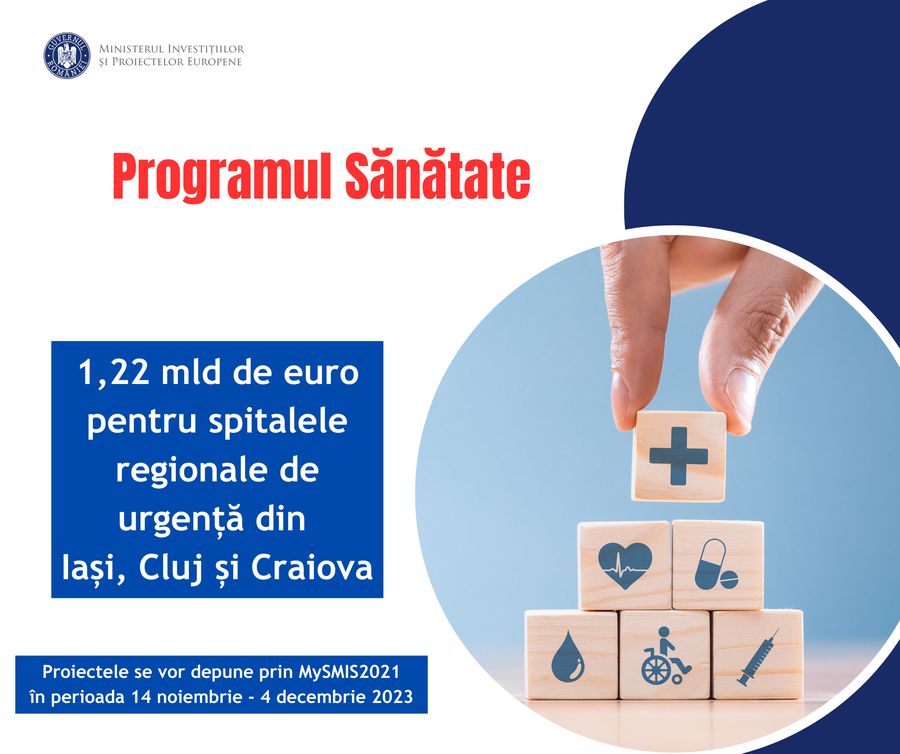 Ministerul Investitiilor si Proiectelor Europene, prin Autoritatea de Management pentru Programul Sanatate, deschide, astazi, apelul de proiecte "Continuarea investitiilor in spitalele regionale de urgenta: Iasi, Cluj, Craiova (faza a II a), proiecte etapizate”.Apelul are o alocare de peste 1,22 miliarde de euro pentru dezvoltarea sistemului medical din zonele rurale ale celor trei orase. Finalizarea acestor investitii este esentiala pentru sistemul romanesc de sanatate. Acestea asigura imbunatatirea accesului la ingrijiri medicale de inalta calitate pentru pacienti, in special pentru cei din zonele rurale deoarece spitalele vor fi echipate cu cele mai recente tehnologii si echipamente medicale si vor avea personal medical calificat. In scopul eficientizarii furnizarii serviciilor spitalicesti, spitalele regionale de urgenta vor trata cazurile cele mai complexe intr-o abordare multidisciplinara, eficienta si sigura din punct de vedere clinic. De asemenea, spitalele regionale vor deveni centre de competenta pentru reteaua de unitati medicale din cele 3 regiuni de dezvoltare pentru a trata pacientii critici si cazurile care necesita tehnologie si expertiza la nivel inalt.