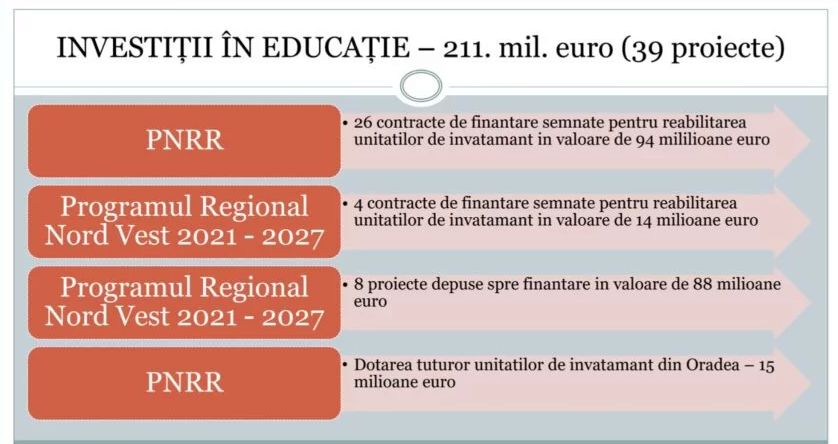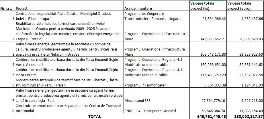 Directia Management Proiecte cu Finantare Internationala (DMPFI) a municipiului Oradea gestioneaza un numar de 113 proiecte cu finantare nerambursabila, avand o valoare totala de 1,2 miliarde euro. Dintre acestea, 8 proiecte au fost finalizate in anul precedent, 58 se afla in implementare, iar 47 sunt in faza de evaluare.Primarul Florin Birta a subliniat importanta acestor fonduri europene in dezvoltarea municipiului Oradea: "Este evident ca Oradea s-a dezvoltat considerabil cu ajutorul fondurilor europene. Avem un portofoliu impresionant de proiecte nerambursabile, iar aceste investitii se regasesc in toate domeniile: infrastructura, sanatate, educatie, energie, spatii verzi si regenerare urbana".