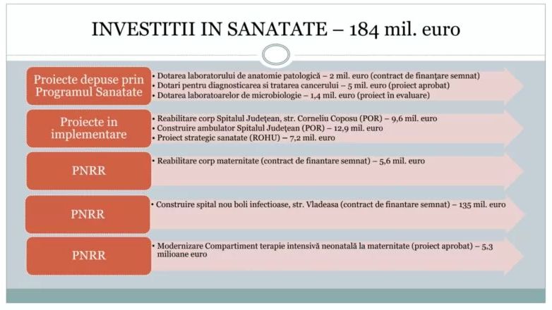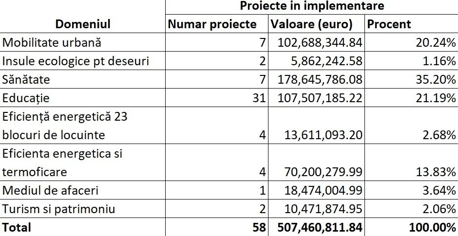 Raportul prezentat include detalii despre alocarea fondurilor pe domenii esentiale pentru dezvoltarea municipiului. Astfel, dintre cele 58 de proiecte aflate in implementare, distributia acestora este urmatoarea: