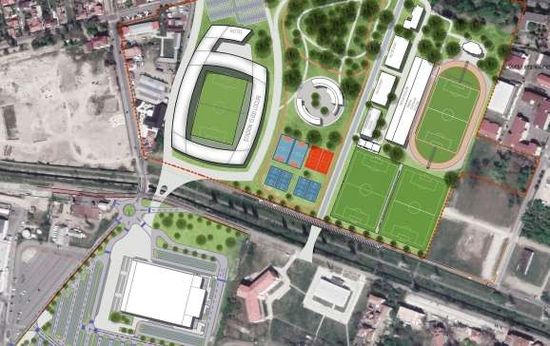 Baza sportiva va cuprinde un stadion modern, cu 16.000 de locuri, instalatie de iluminat nocturna, un hotel cu 46 de camere, parcare subterana cu 150 de locuri, o piateta la suprafata. In jurul stadionului, municipalitatea are in proiect sa amenajeze un parc si terenuri pentru sportul de masa, inclusiv de fotbal si de tenis, pe amplasamentul actualei Gradini Zoologice care va fi relocata in afara orasului.