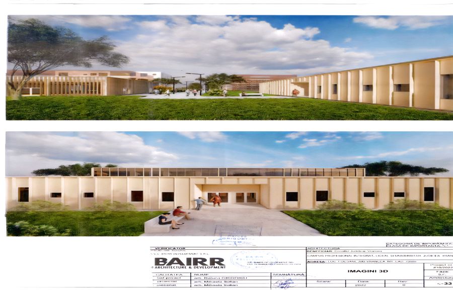 Contractul de constructie a campusului profesional integrat, liceal si universitar care va fi realizat in judetul Vrancea este extrem de disputat, un numar total de 10 asocieri de companii fiind interesate de proiectarea si executia acestuia. Valoarea estimata a contractului este de aproape 91,3 milioane de lei (fara TVA), durata de implementare a acestuia fiind prevazuta la 18 luni, din care 6 pentru proiectare si 12 pentru constructie.Campusul scolar si universitar urmeaza sa fie construit in Focsani pe o suprafata de peste doua hectare si va include 4 corpuri de cladire: unul principal (cu sali de curs, amfiteatru, biblioteca cu sala de lectura, ateliere digitale si laboratoare), un camin studentesc, cantina si baza sportiva. De asemenea, centrul va fi dotat cu sisteme de energie alternativa (panouri fotovoltaice si statii de incarcare electrica auto) si o parcare proprie.