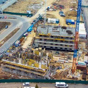 La cladirea B, grinzile de fundare, conectate cu pilotii de mare adancime au fost finalizate si au fost executate elementele verticale: suprastructura la parter + etajele 1, 2, 3 si 4. In prezent se lucreaza la armarea planseului si la pregatirea elementelor verticale ale suprastructurii pentru etajul 5 – armare, cofrare, turnare.