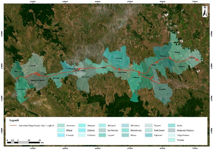 Autostrada Targu Neamt - Iasi - Ungheni se dezvolta pe teritoriul judetului Iasi pe un coridor de la Vest spre Est incepand din apropiere de intersectia cu DN2 (Motca) pana la legatura cu Podul peste Prut la Ungheni (UAT Golaiesti) si traverseaza UAT-urile: Aroneanu, Baltati, Costesti, Dumesti, Erbiceni, Golaiesti, Helesteni, Ion Neculce, Letcani, Miroslava, Miroslovesti, Motca, Pascani, Podu Iloaiei, Popricani, Rediu, Ruginoasa, Stolniceni-Prajescu, Targu Frumos, Ungheni si Victoria.