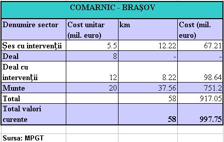 Potrivit datelor incluse in Master Planul General de Transport (MPGT), sectorul de autostrada Comarnic - Brasov face parte din proiectele prevazute pentru demararea atat a studiilor de fezabilitate, cat si a lucrarilor de executie in prima perioada de programare, respectiv 2014-2020. Lungimea totala a sectorului de autostrada este de 58 km, iar valoarea estimata pentru aceasta interventie este de 997 milioane de euro (fara TVA), respectiv 1,237 miliarde euro (inclusiv TVA).