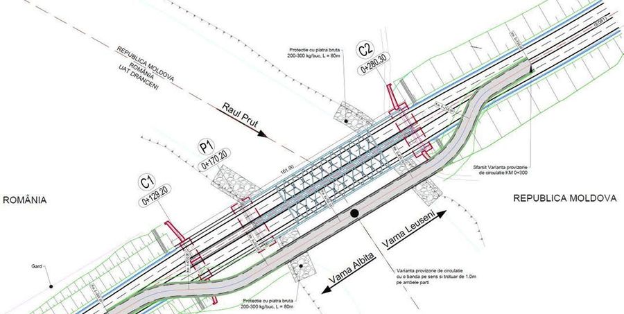 "Conform proiectului, podul va avea lungimea suprastructurii de 150,90 m si lungimea totala de 161 m. In plan, podul va fi dispus in aliniament, cu traversarea aproximativ perpendiculara a raului Prut. Geometria sectiunii transversale a podului va asigura, pentru fiecare fir de circulatie, o latime a partii carosabile de 9,50 m si cate un trotuar pietonal de 1,60 m, intre cele doua fire de circulatie fiind prevazut un spatiu pentru zona mediana de latime variabila. In vederea atingerii obiectivelor mentionate anterior, pe perioada realizarii lucrarilor de amenajare a podului peste raul Prut de pe DN24B la km 42+092 intre Romania si Republica Moldova, traficul se va desfasura pe o varianta provizorie”, a declarat Mihaela Budianu, directorul executiv al APM Vaslui, adaugand ca valoarea investitiei, de aproape 185 de milioane de lei, va fi asigurata prin Mecanismul pentru Interconectarea Europei (CEF).