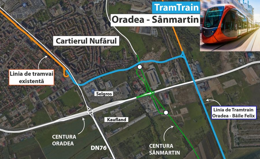 1. Directia Oradea - Sanmartin (8,4 km), cu doua tronsoane. Tronsonul 1: Linia de tramvai (bucla Nufarul) - calea ferata (linia 324) va avea o lungime de 1,4 km, doua puncte de oprire spre cartierul Nufarul (in spatele strazii Morii si la intersectia cu calea ferata). Tronsonul 2: Linia 324 - Sanmartin va avea 7 km, 5 puncte de oprire (Centura Oradea; Cartierul Tineretului Sanmartin; 1 Mai; Felix si limita Cordau, langa Inelul Rutier Metropolitan), precum si o pasarela pietonala supraterana, in Cartier Tineretului.
