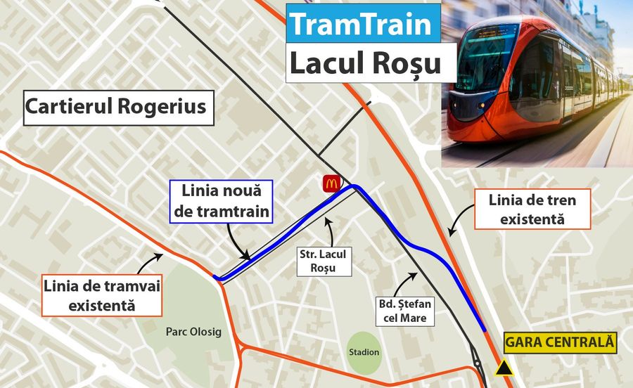 2. Racordarea liniei de tramvai la Gara Centrala (1,3 km), cu doua tronsoane. Tronsonul 1: Parc Olosig - Lacul Rosu - Stefan cel Mare va avea o lungime de 1 km si doua puncte de oprire (Lacul Rosu si Stefan cel Mare - inainte de McDonald's). Tronsonul 2 (cale ferata): Stefan cel Mare - Gara CFR (270 m). Valoarea totala a investitiei este de 43,5 milioane de lei (8,7 milioane de euro).