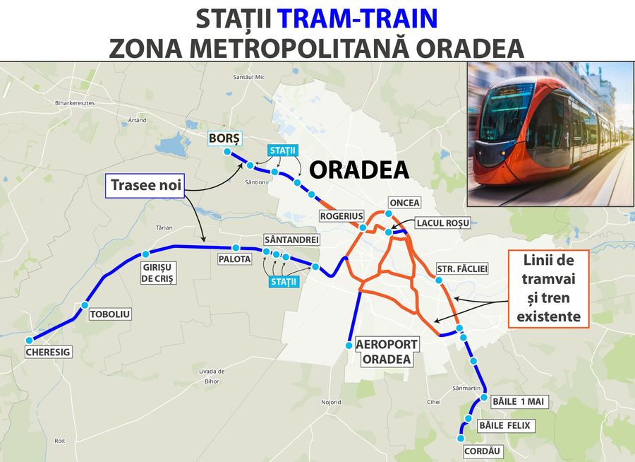 Primaria Oradea, in parteneriat cu Consiliul Judetean (CJ) Bihor vor dezvolta o retea de transport in regim tram-tren in Zona Metropolitana Oradea, in urma unei investitii de 1,11 miliarde lei, inclusiv TVA. Proiectul de mobilitate metropolitana prevede sase tronsoane, integrate intr-o retea de linii feroviare electrificate, pe care vor circula 13 tram-trenuri. Noua retea va conecta Municipiul Oradea, pe mai multe directii, cu Aeroportul Oradea, Sanmartin - Baile 1 Mai - Baile Felix (Cordau), Bors (Parcul industrial) si Santandrei - Girisu de Cris - Toboliu - Cheresig.Consiliul Local Oradea a aprobat, la data de 9 noiembrie, studiile de fezabilitate si indicatorii tehnico-economici pentru dezvoltarea mobilitatii metropolitane pentru zona de aeroport, pentru legatura Bors - Hotel Iris, legatura Oradea - Toboliu-Cheresig si pentru interconectarea infrastructurii la reteaua de cale ferata pe tronsonul Oradea Est - Oradea - Oradea Vest.