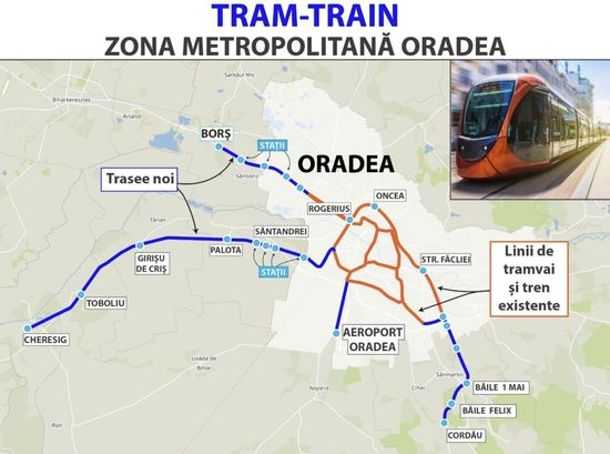 Presedintele Consiliului Judetean Bihor, Ilie Bolojan, a semnat vineri, 26 iulie, protocolul de colaborare cu Compania Nationala de Cai Ferate „CFR” SA pentru „Dezvoltarea retelei de tram-train metropolitan Oradea”.Proiectul vizeaza investitii in reabilitarea, modernizarea si extinderea infrastructurii feroviare pentru a crea o retea tram-train care sa conecteze Municipiul Oradea cu localitatile invecinate. Noua retea va asigura legatura cu Aeroportul Oradea, Sanmartin - Baile 1 Mai - Baile Felix (Cordau), Bors (Parcul industrial) si Santandrei - Girisu de Cris - Toboliu - Cheresig.