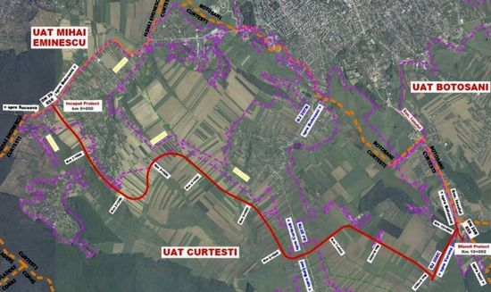 "Soseaua de centura a municipiului Botosani prin Curtesti", al carui beneficiar este Asociatia de Dezvoltare Intercomunitara "Zona Metropolitana Botosani", va avea o lungime de 10 kilometri, cu 18 podete, 4 interesectii sub forma de sensuri giratorii si parcare. Traseul va avea ca repere sensul giratoriu la intrarea din DN 29 Botosani-Suceava, va strabate extravilanul comunei Curtesti, va continua pana la bifurcatia cu drumul judetean catre Vorona si va avea punctul terminus la sensul giratoriu de la Lebada, cu iesirea spre Iasi.