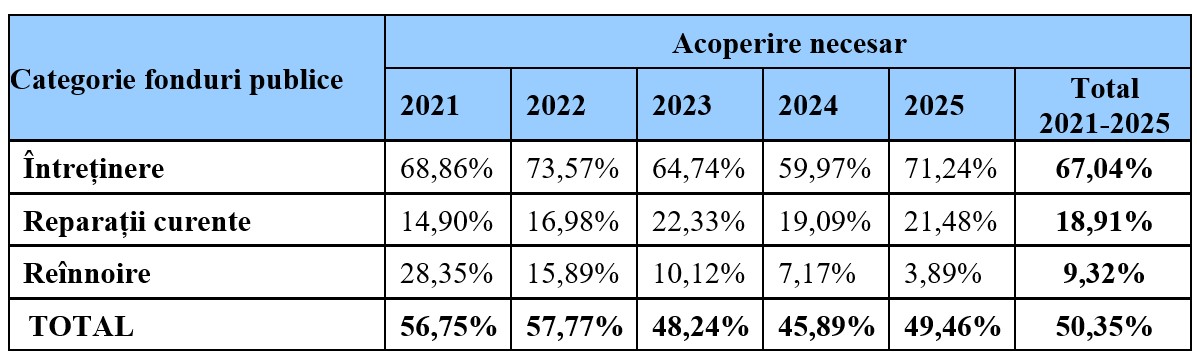 In 2025, Compania Nationala de Cai Ferate "CFR" SA dispune de fonduri cu o valoare totala de aproape 11,5 miliarde lei pentru administrarea infrastructurii feroviare, din care cea mai mare parte, 8,18 miliarde lei, va fi utilizata pentru proiectele de investitii privind modernizarea/ reabilitarea si dezvoltarea infrastructurii feroviare publice. Pentru intretinerea si asigurarea functionarii infrastructurii feroviare, bugetul alocat este in cuantum de 3,05 miliarde lei, in timp ce pentru reparatii curente ale cailor ferate s-au alocat 46,8 milioane de lei, iar pentru reinnoirea/ reparatia capitala a infrastructurii feroviare publice, fonduri de 187,2 milioane de lei.Potrivit datelor CFR SA, din pacate, finantarea multi-anuala prevazuta pentru anii urmatori nu acopera necesarul in toate zonele de interventie tehnica a Companiei - intretinere, reparatii curente si reinnoiri a infrastructurii feroviare din Romania, Deficitul de finantare pentru perioada 2021-2025 este de 12,7 miliarde lei, ceea ce corespunde unei alocari financiare de 12,8 miliarde lei fata de un necesar de 25,5 miliarde lei, valori stabilite si aprobate prin hotarare a guvernului, ceea ce corespunde unei alocari de numai 50,35% din necesar.