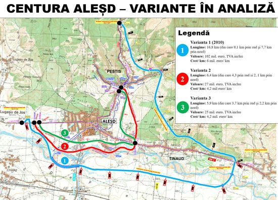 In ultimele zile ale anului trecut, reprezentantii Consiliului Judetean (CJ) Bihor si cei ai comisiei tehnice din cadrul Companiei Nationale de Administrare a Infrastructurii Rutiere (CNAIR) SA au analizat cele trei variante de traseu propuse pentru constructia variantei ocolitoare a orasului Alesd.Prima varianta, propusa in anul 2010, presupune un traseu cu o lungime de 16,8 km, care traverseaza raul Crisul Repede in sud si o zona deluroasa si accidentata in nord. Lungimea si complexitatea lucrarilor ar urca valoarea proiectului la 102 milioane de euro (inclusiv TVA), adica 6 milioane de euro/km.