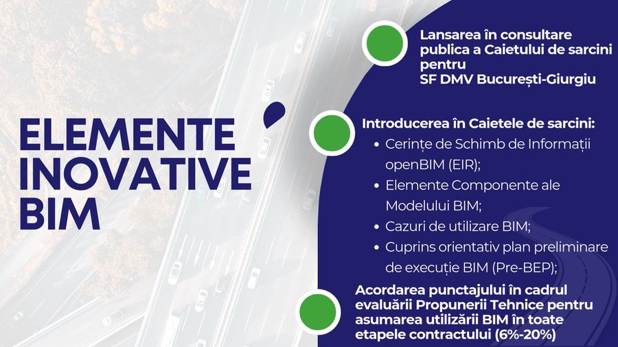 De asemenea, CNIR va acorda punctaj suplimentar si pentru includerea tehnologiei BIM in executie. Cu prilejul participarii la conferinta BIMcon 2024, organizata de asociatia BIMTECH/ buildingSMART Romania, care a avut loc la Bucuresti in perioada 31 octombrie-1 noiembrie 2024, Gabriel Budescu subliniat importanta inovarii si digitalizarii pentru proiectele de infrastructura rutiera si a prezentat demersurile pentru implementarea tehnologiei BIM in proiectele derulate.