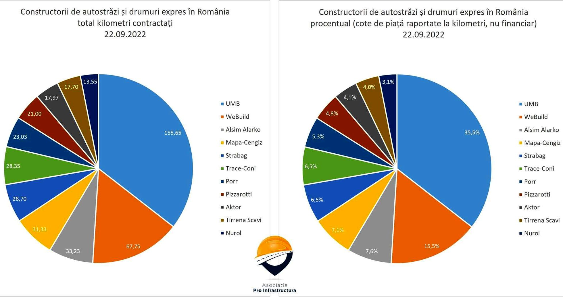 "Cei de la UMB au acum in tolba 9 din totalul de 23 de contracte, peste 155 kilometri din cei aproape 440 de kilometri de autostrazi si drumuri expres aflati in prezent in executie in Romania, adica peste 35% cota de piata pe drumurile de viteza. Au sanse mari sa puna mana si pe tronsoanele 2 si 3 din Buzau-Focsani, dar si pe segmentul ramas din Lugoj-Deva, unde tocmai au fost dati castigatori (sa vedem daca se depun contestatii). Aproape sigur au ofertat la fel de agresiv pentru toate cele 6 sectoare din Focsani-Bacau si Bacau-Pascani", arata datele asociatiei.