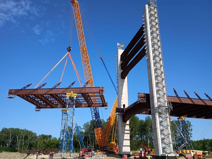 La nivelul structurilor incluse in proiect, continua lucrarile la podul peste Siret, de 1.800 de metri, cu montarea tablierului de pod hobanat pe malul drept si a tablierului si riglelor de rigidizare pe malul stang. De asemenea, se monteaza tiranti pod arc peste calea ferata, dar si predalele si antretoazele.
