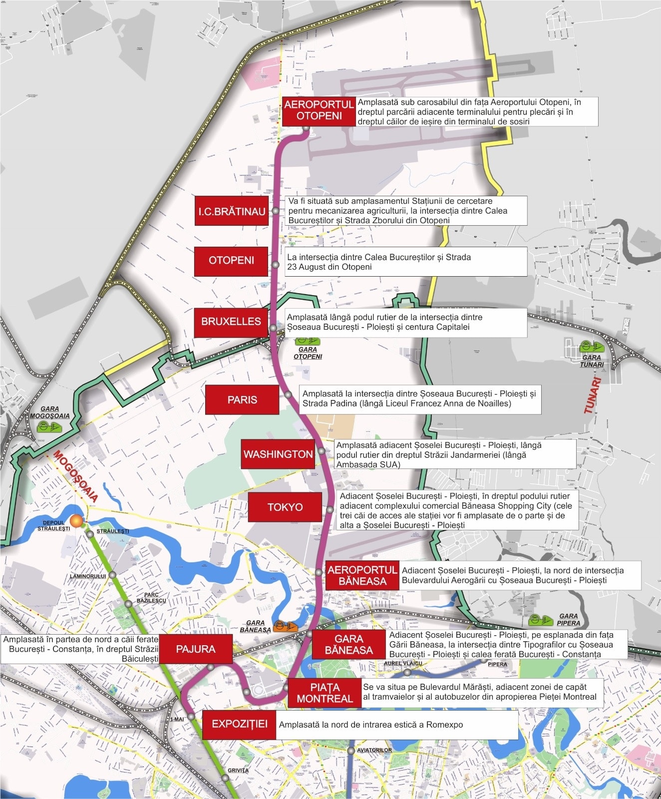 Magistrala 6 vizeaza extinderea retelei de metrou din statia 1 Mai (de pe Magistrala 4) pana la Aeroportul International Henri Coanda - Otopeni si va avea un traseu de 14,2 km (integral in subteran) si 12 statii: 1 Mai (existenta), Pajura, Expozitiei, Piata Montreal, Gara Baneasa, Aeroport Baneasa, Tokyo, Washington, Paris, Bruxelles, Otopeni, Ion I.C. Bratianu, Aeroport Henri Coanda.