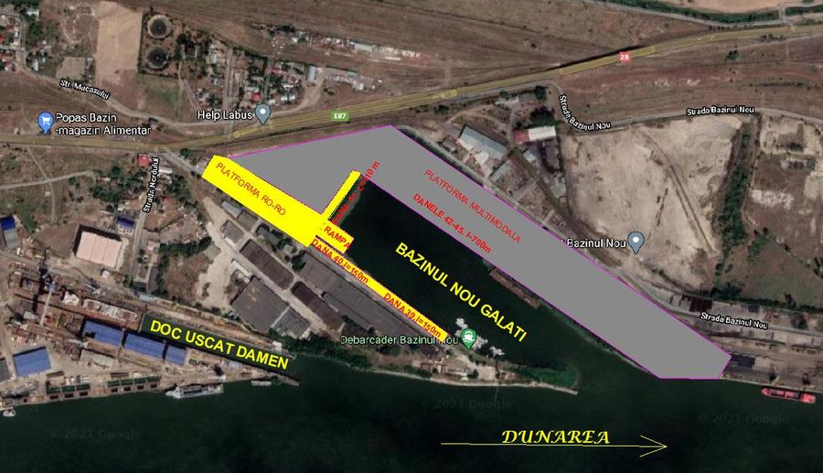 Portul Galati are la dispozitie 136,94 milioane de lei pentru amenajarea danei Ro-Ro (roll on/roll off) din Bazinul Nou, ceea ce va permite cresterea cu aproximativ 48.000 tone (in primul an de exploatare) a volumului de marfuri, reducerea timpilor de incarcare/ descarcare si cresterea sigurantei in timpul operatiunilor portuare. Lucrarile trebuie finalizate tot pana la sfarsitul anului 2023 si vizeaza: reabilitarea cheurilor de acostare ale danelor 39 si 40, amenajarea rampei Ro-Ro la dana 41, amenajarea cheului intre rampa Ro-Ro si platforma multimodala.