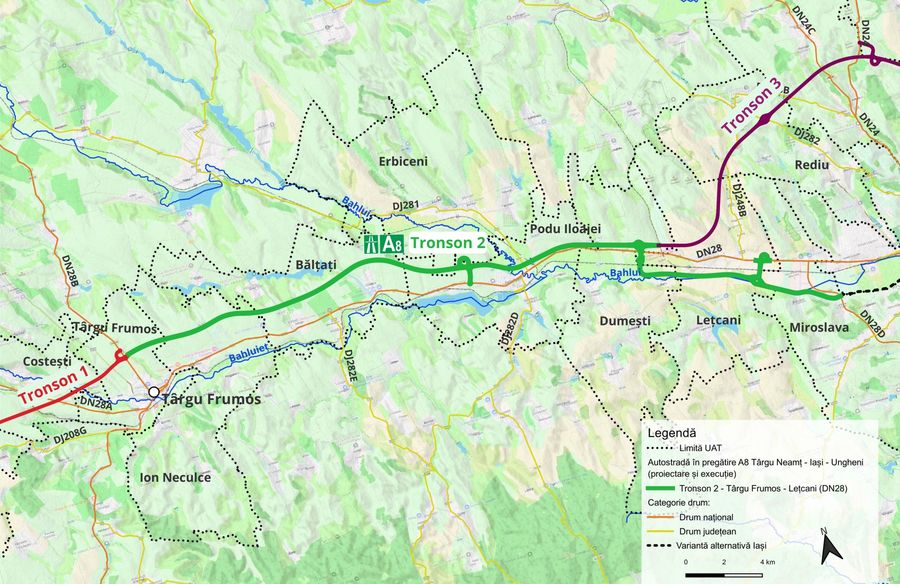 Compania Nationala de Investitii Rutiere (CNIR) SA a primit 6 oferte, de la constructori din Romania, Austria si Turcia, la licitatia pe care o organizeaza pentru atribuirea contractului de proiectare si executie a tronsonului 2 al Autostrazii Unirii (A8), pe distanta Targu Frumos - Letcani. Acest al doilea lot are o lungime de 28,6 km, un cost estimat la 5,5 miliarde lei (fara TVA), iar finantarea investitiei este asigurata din fonduri europene, prin Programul Transport 2021-2027.Durata de realizare a intregului tronson 2 Targu Frumos - Letcani este de 46 de luni (10 pentru proiectare si 36 pentru executie). Pentru a asigura finalizarea in cel mult 14 luni a segmentului de autostrada care va functiona ca o centura a localitatii Podu Iloaiei, CNIR a prevazut acordarea unui punctaj suplimentar constructorului care isi asuma si prioritizeaza acest segment cu o lungime de 4 km. Contractul include si realizarea a 33 de poduri si pasaje, a doua tunele si 3 noduri rutiere. In cadrul contractului vor mai fi executate si un drum de legatura cu DN 28D, cu doua benzi si o lungime de 5,23 km, un drum de legatura cu DN 28, cu 4 benzi si o lungime de 7,6 km, precum si doua parcari de scurta durata, un spatiu de servicii tip S3 si un Centru de Intretinere si Coordonare (CIC).
