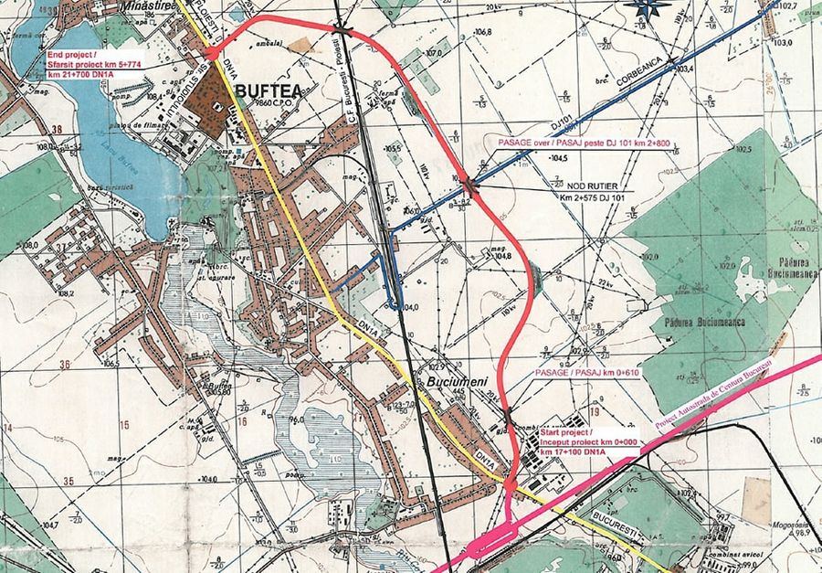 Indicatorii tehnico-economici aferenti proiectului de constructie a variantei ocolitoare a orasului Buftea au fost reaprobati de Guvernul Romaniei, iar contractul de proiectare si executie, atribuit inca din decembrie 2023, poate fi semnat. Castigatorul desemnat al licitatiei este compania Porr Construct, valoarea lucrarilor fiind de 281,17 milioane de lei (circa 67 milioane euro), fara TVA.Lucrarile includ constructia a 5,7 km de drum, precum si realizarea iluminatului public, amenajarea a doua parcari, in care se are in vedere si montarea de sisteme de cantarire a autocamioanelor si de utilare a acestora cu statii de incarcare pentru autovehiculele electrice si instalarea unui sistem de colectare si scurgere a apelor. De asemenea, vor fi construite si 3 pasaje rutiere, peste calea ferata Bucuresti - Ploiesti (81,90 m lungime), peste DJ101 (84,9 m) si peste un drum betonat (36,1 m) si vor fi amenajate trei intersectii la nivel, la intersectia cu DN 1A (la km 17+100) - care va asigura conexiunea cu nodul rutier al autostrazii de centura Bucuresti), la jonctiunea cu DN 1A (la km 21+700), utilizand Strada Metalurgiei, respectiv la intersectia cu DJ101.