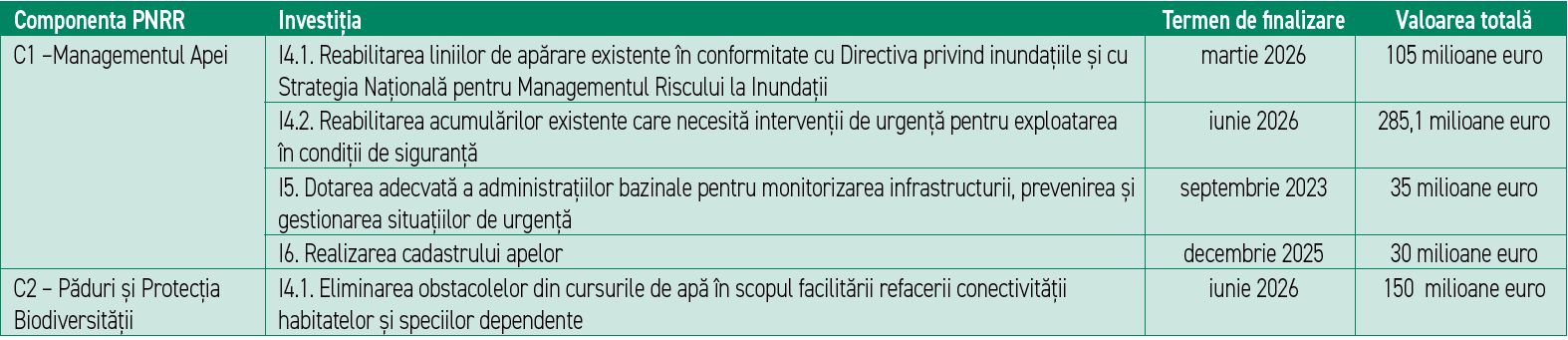 Totodata, administratiile bazinale vor fi dotate adecvat pentru monitorizarea infrastructurii, prevenirea si gestionarea situatiilor de urgenta, iar obstacolele din cursurile de apa vor fi eliminate in scopul facilitarii refacerii conectivitatii habitatelor si speciilor dependente de apa.
