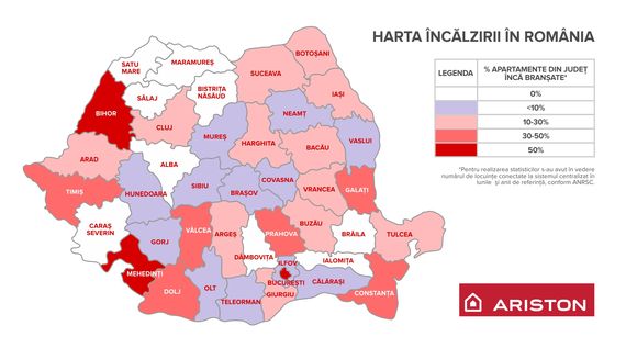 Conform datelor ANRSC, in topul judetelor unde s-au raportat cele mai multe debransari se afla Galati, unde aproape 20.300 de apartamente au renuntat la sistemul centralizat de incalzire. Pe locurile urmatoare in top se afla Constanta (cu peste 4.900 de apartamente) si Prahova (4.200). Analiza realizata de Ariston Thermo Romania pe baza datelor raportate de ANRSC arata ca, la finalul lui 2015, in 9 judete din tara intreaga populatie a optat pentru debransare si foloseste sisteme proprii de incalzire a locuintei. De asemenea, alte 12 judete mai au doar sub 10% din locuinte racordate la CET-uri. "In urmatoarele 18 judete din tara, procentul apartamentelor bransate variaza intre 10 si 50%, numarul maxim de locuinte conectate inca la sistemul centralizat fiind intalnit doar in Bucuresti, Mehedinti si Bihor, cu peste 50%", a mai aratat Catalin Draguleanu. Potrivit analizei, circa 40% din locuintele din Bucuresti sunt debransate de la sistemul centralizat de incalzire.