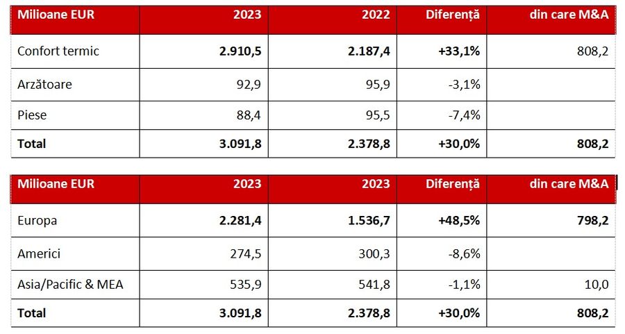 Venitul net s-a ridicat la 3,091.8 miliarde de euro, in crestere cu 30% fata de 2,378.8 miliarde de euro inregistrate in 2022. Cresterea a venit din partea diviziei Confort termic din Europa, cu o contributie semnificativa din partea achizitiei Wolf & Brink, finalizata in ianuarie 2023.