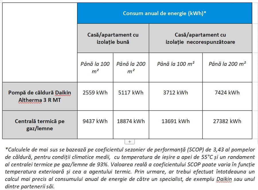 O comparatie a eficientei realizata de Daikin indica faptul ca pompa de caldura Daikin Altherma 3 R MT, lansata recent, este de trei pana la patru ori mai eficienta decat o centrala termica pe gaz sau lemne.
