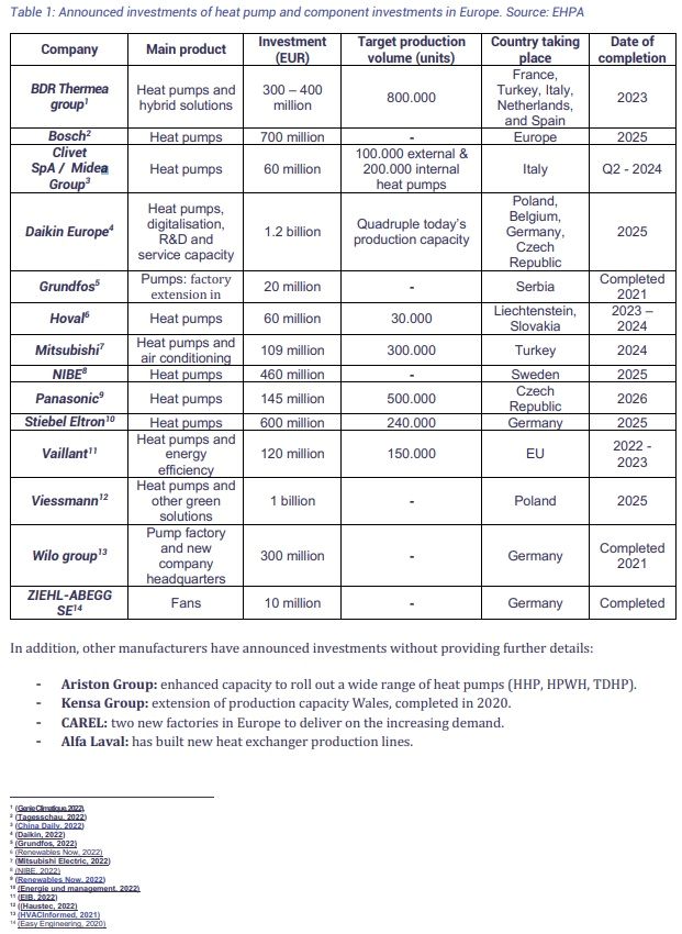 Investitii cu o valoare de peste 5 miliarde euro sunt alocate pentru productia de pompe de caldura in Europa in perioada 2022-2025. Compania Daikin Europe si grupurile germane Viessmann, Bosch si Stiebel Eltron au anuntat cele mai mari investitii in domeniu, de 1,2 miliarde euro, un miliard de euro, 700 de milioane de euro, respectiv 600 de milioane de euro, dar fonduri importante vor fi alocate si de compania suedeza NIBE (460 de milioane de euro), de grupul BDT Thermea (300-400 de milioane de euro), dar si de Wilo (300 de milioane de euro).In contextul in care industria pompelor de caldura se va dezvolta exponential in anii urmatori, specialistii vorbesc deja de o potentiala lipsa a instalatorilor avizati in instalarea acestor sisteme.