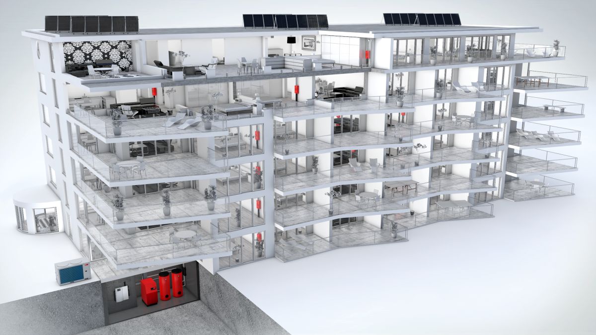 In ceea ce priveste casele multifamiliale, viziunea Hoval este de a realiza sisteme centralizate si, in acest sens, pentru a raspunde tuturor particularitatilor, atat din punct de vedere al consumatorilor finali, cat si din perspectiva conditiilor reale de implementare, Hoval a dezvoltat mai multe variante, care implica pompe de caldura aer-apa de mare capacitate, cazane in condensatie de tip containerizat - CabinSlim si sisteme de distributie inteligente si eficiente, de tip TransTherm - puncte termice de transfer.