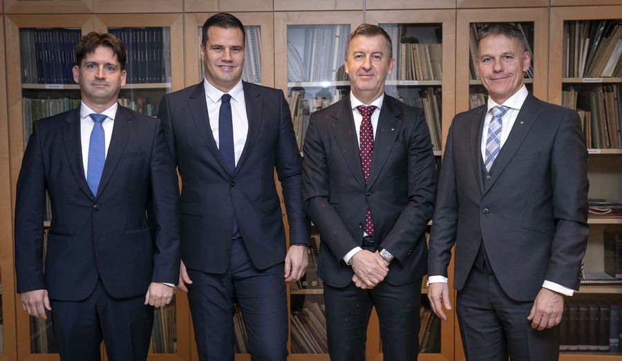 Foto, de la stanga la dreapta: Ács Balázs (vicepresedintele Masterplast), Tibor Dávid (presedintele Masterplast), Scheer Sándor (presedintele CA al Market Építő Zrt.) si Báthory Balázs (directorul adjunct al diviziei de inovare a Market Építő Zrt.)