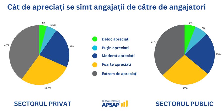 Cei mai multi angajati din Romania (60%) nu se simt apreciati de angajatori, fie ca lucreaza la stat, fie ca lucreaza la privat, iar mai mult de jumatate dintre ei spun ca nu se simt motivati de organizatia din care fac parte sa se autodepaseasca din punct de vedere profesional, arata rezultatele unui sondaj realizat de Centrul de Formare APSAP, cel mai mare centru de cursuri de formare profesionala din tara.Stat vs privat: unde se simt angajatii romani mai apreciati si mai motivati