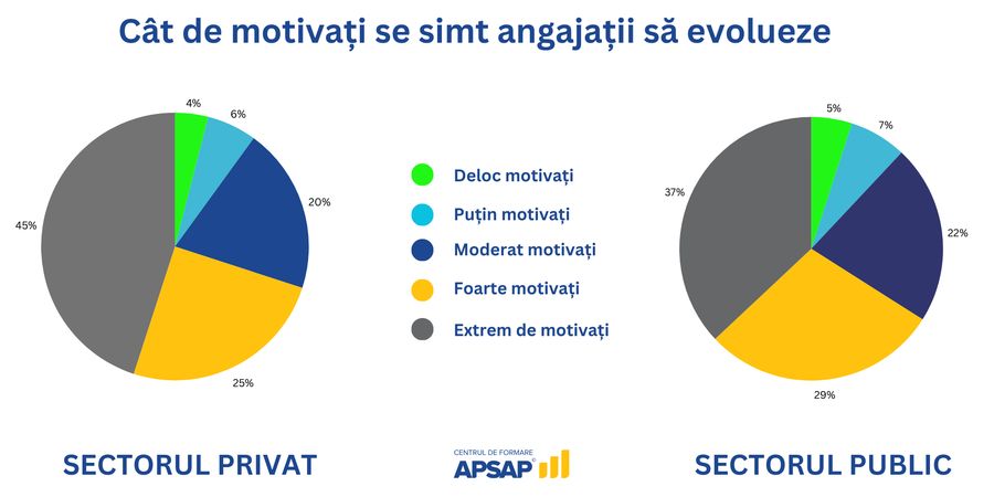 “In cele mai multe cazuri, angajatii romani nu doar ca nu se simt apreciati de angajatori, dar 55% dintre ei nici nu se simt motivati de companiile la care lucreaza, iar multi au temeri majore legate de activitatea lor din campul muncii. Insa, ceea ce este cu atat mai interesant este faptul ca angajatii la stat, in proportie de 63%, se simt mai putin apreciati de angajator decat cei care lucreaza in mediul privat. Totodata, angajatii din institutii publice nici nu se simt motivati de angajatorul lor sa se autodepaseasca profesional. Acesta este unul dintre motivele pentru care, alaturi de dorinta de a se remarca, tot mai multi romani se inscriu la cursuri de perfectionare, tot mai multi angajati la stat dorind sa schimbe domeniul profesional si sa lucreze in mediul privat”, declara Bogdan-Costin Farsirotu, presedintele Centrului de Formare APSAP si fondatorul platformei www.cursuri-functionari.ro.