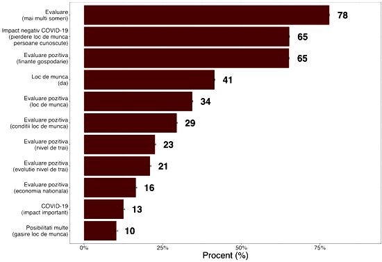 Pesimismul este prezent si in evaluarea nivelului de trai. Doar 21% dintre respondenti spun ca nivelul de trai a crescut comparativ cu anii anteriori, desi, asa cum arata datele Institutului National de Statistica, cu exceptia momentului de inceput al pandemiei, am avut o crestere semnificativa a PIB si a PIB per capita in ultimii ani. Exista o diferenta importanta intre evolutiile in general pozitive ale economiei si felul mult mai gri in care se raporteaza romanii la aceste aspecte.