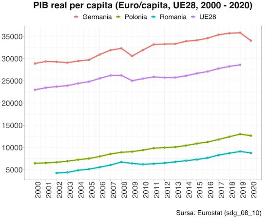 Urmeaza perioada crizei economice, in care valoarea indicatorului scade, pentru ca abia in 2013 sa inregistram o valoare superioara (6.770 de euro) celei din 2018. Dupa 2013 avem o crestere constanta a PIB real per capita, pana la nivelul de 9.110 euro in 2019. Anul 2020 este marcat de pandemia Covid-19 si de efectele sale economice, care se traduc intr-un PIB real per capita (8.780 de euro) usor peste cel din 2018 (8.700 de euro). In ciuda evolutiei pozitive, Romania nu reuseste sa reduca substantial decalajele de dezvoltare care o separa nu doar de media Uniunii Europene si Germania, ci si fata de alte tari din regiune precum Polonia, mai arata datele DDD.