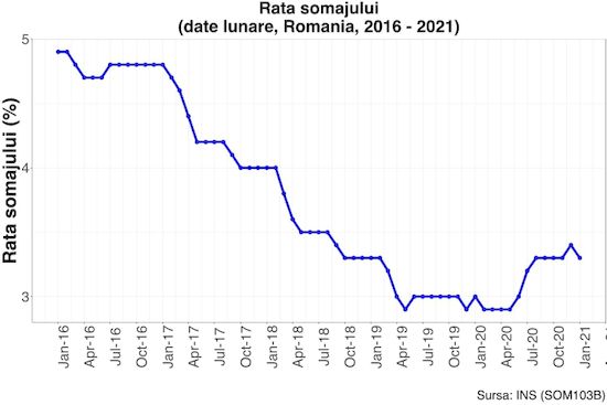 In ceea ce priveste rata somajului (figura 3), de la 4,9% in ianuarie 2016, acesta a ajuns la 2,9% in mai 2020, pentru a creste apoi la 3,3% in ianuarie 2021. "Ramane de vazut in ce masura suntem intr-un punct de inflexiune sau daca, odata cu accelerarea vaccinarii si asteptata revenire, ne vom intoarce la tendinta de reducere a somajului in general identificata pentru ultimii cinci ani", explica autorii studiului.
