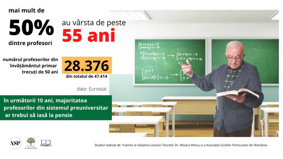 Romania se indreapta spre o criza de personal puternica in sectorul educatiei, in conditiile in care, in prezent, mai putin de 1 din 10 profesori are varsta sub 30 de ani. Nu este exclus ca peste 50% dintre profesori sa iasa la pensie in urmatorii 10 ani, astfel ca educatia unei intregi generatii sa fie sub semnul intrebarii, asta mai cu seama ca nivelul salarial extrem de redus va face ca si migratia catre locuri de munca mai bine platite sa se accentueze. O solutie optima vazuta de specialisti o reprezinta scutirea de la plata impozitului pe venit pentru profesori, la fel ca in cercetare, constructii, agricultura si IT.Potrivit datelor Oficiului European de Statistica Eurostat, din cei 47.414 de profesori din invatamantul primar din Romania, mai mult de jumatate (28.376) aveau, in 2020, varsta de peste 50 de ani. 7734 dintre ei aveau varsta intre 55 si 64 de ani, iar 820 predau cu toate ca au trecut de 65 de ani. Situatia urmeaza acelasi tipar, cu profesori in varsta, si in invatamantul gimnazial si liceal.