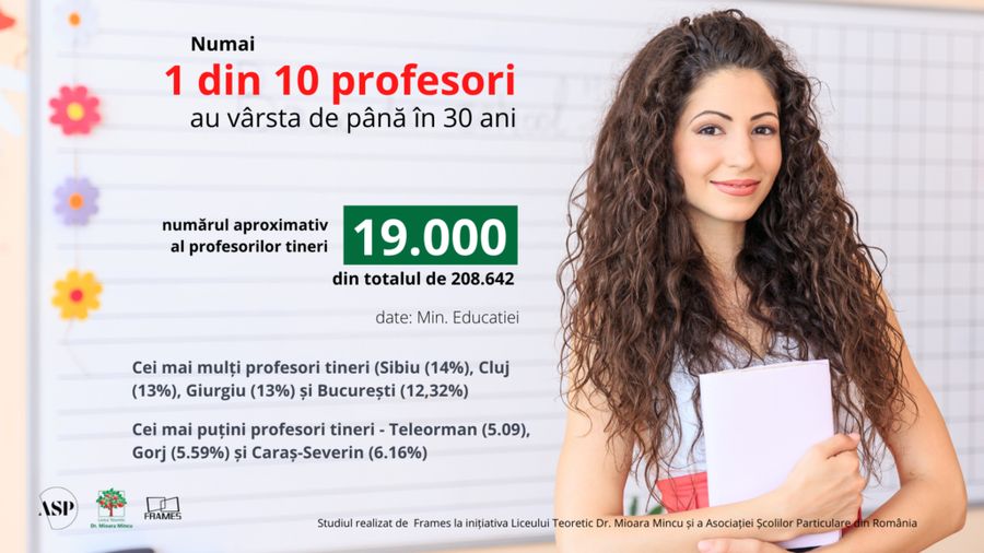 Datele Ministerului Educatiei arata ca in invatamantul preuniversitar romanesc lucreaza, in prezent, numai aprox. 19.000 de cadre didactice cu varsta cuprinsa intre 18 si 30 de ani, in conditiile in care numarul total al profesorilor din tara noastra era, in anul scolar abia incheiat, de 208.642.