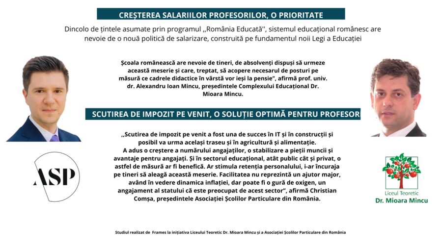 „Eliminarea impozitarii salariilor cadrelor didactice din invatamantul preuniversitar de stat si privat ar fi o masura eficienta, ce poate fi decisa rapid, un stimul pentru un sistem educational aflat in pragul unei crize profunde”, spune prof. univ. dr. Alexandru Ioan Mincu, presedintele Complexului Educational Dr. Mioara Mincu.