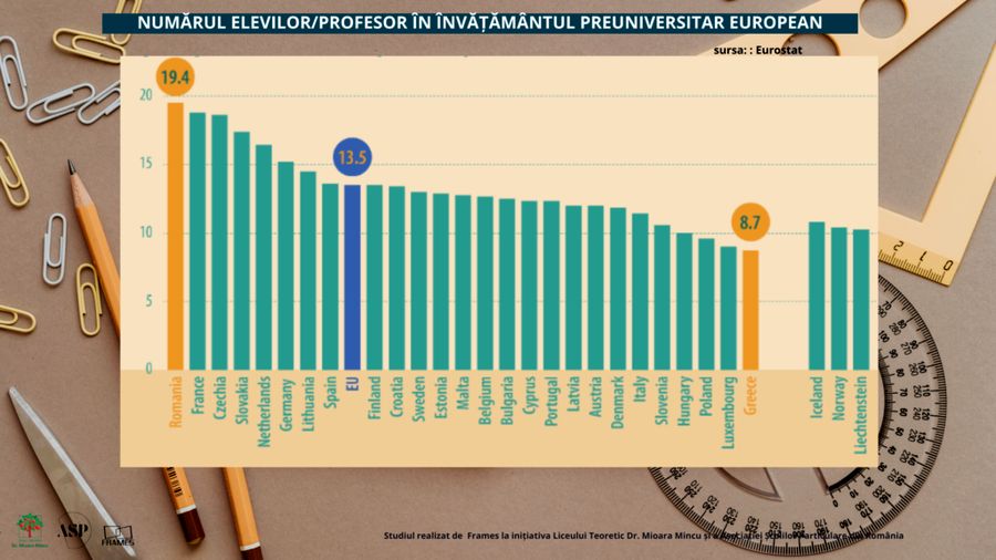 La noi raportul este de 19,4, in timp ce media europeana, la nivelul primar, este de 13,5. Cele mai scazute rate au fost inregistrate in Grecia (8,7), Luxemburg (9,0) si Polonia (9,6).
