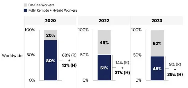 In comparatie cu alti angajatori din intreaga lume, cei din Japonia se concentreaza mai mult pe lucratorii care se intorc la birou cu norma intreaga. In Japonia, numarul de lucratori din domeniul cunoasterii ce isi desfasoara activitatea integral de la distanta si in mod hibrid va totaliza 29% din forta de munca in 2023.