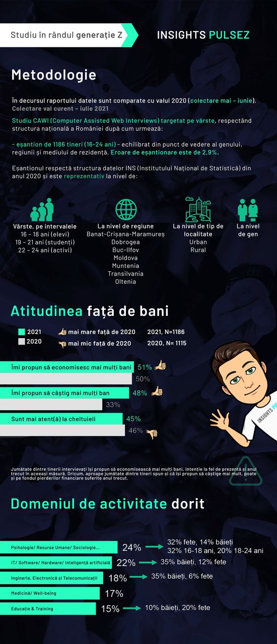 Studiul „Insights PulseZ”, aflat la cea de-a doua editie nationala, a fost conceput si coordonat de specialistii programelor nationale antreprenoriale „Vreau sa Fiu Antreprenor” (VSFA) si „Insights” - din cadrul organizatiei Romanian Business Leaders (RBL) si realizat de agentia de studii de piata iZi data in randul a aproximativ 1.200 de tineri din Romania - pe un esantion reprezentativ la nivel national (urban+rural, tineri cu varste cuprinse intre 16 si 24 de ani). Cercetarea s-a axat pe mai multe aspecte, printre care si atitudinea tinerilor referitoare la bani, pe gestionarea resurselor financiare si preferintele lor de achizitie, precum si pe factorii motivatori in alegerea unui job si a ghidarii in viata, in noul context pandemic – in randul membrilor generatiei Z (cei nascuti dupa 1995, cunoscuti ca iGeneration, Centannials sau „nativi digitali”), in perioada iunie-iulie 2021, comparativ cu valul 2020 (perioada mai-iunie 2021, cand a fost desfasurata prima editie a studiului).