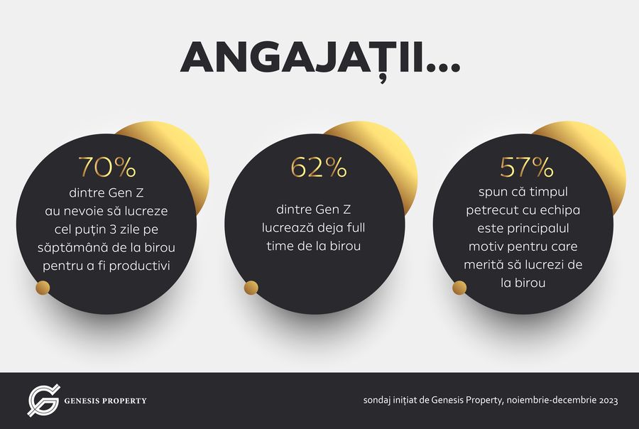 In ciuda schimbarilor aduse de lucrul de la distanta si de modelul hibrid in ultimii ani, biroul ramane locul preferat de majoritatea tinerilor pentru a-si desfasura activitatile in prezent. Aici pot lucra intr-un mod eficient, colaborativ si creativ, avand astfel oportunitati excelente de dezvoltare profesionala si de avansare in cariera. Astfel, pentru a-si atinge maximul de productivitate, aproape 70% dintre angajatii din Generatia Z spun ca au nevoie de cel putin 3 zile pe saptamana la birou, iar 62% lucreaza deja full time de la birou, potrivit unui sondaj initiat de Genesis Property, din 1.208 de respondenti reprezentand mai multe generatii, la nivel national. Biroul este mai important pentru Gen Z decat pentru Mileniali, care simt nevoia sa lucreze din birou cel putin 3 zile pe saptamana in proportie de 56%, in timp ce in cazul Generation X procentul ajunge la 73%. In prezent, 51% dintre Mileniali si 65% dintre angajatii din Generatia X lucreaza in fiecare zi a saptamanii la birou.
