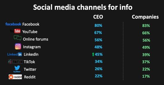 Cele mai populare canale online in randul romanilor care urmaresc liderii din diferite industrii sunt: Facebook (80%), Youtube (67%), forumurile online (56%), Instagram (48%), Linkedin (45%) si Tik Tok (34%).