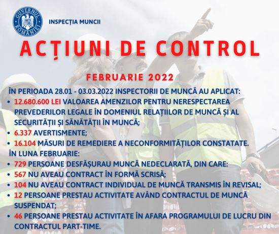 Inspectia Muncii, prin inspectoratele teritoriale de munca, a desfasurat, in perioada 28.01 - 03.03.2022, actiuni de control in urma carora s-au aplicat amenzi in valoare de 12.680.600 lei pentru nerespectarea prevederilor legale in domeniul relatiilor de munca si al securitatii si sanatatii in munca. Au fost aplicate 6.337 avertismente si au fost dispuse 16.104 masuri de remediere a neconformitatilor constatate.In luna februarie, au fost identificate 729 persoane desfasurand munca nedeclarata, dintre acestea, 567 nu aveau intocmit contract individual de munca; 104 nu aveau contract individual de munca transmis in Revisal, 12 persoane prestau activitate avand contractul de munca suspendat, iar 46 persoane prestau activitate in afara programului de lucru din contractul part-time.