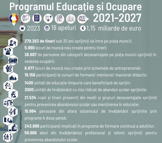 „Separat de investitiile in proiecte de infrastructura sau in serviciile publice esentiale precum sanatatea, Programul Educatie si Ocupare ne ofera oportunitatea de a investi in cea mai importanta resursa pe care o avem: oameni. Stim cu totii care sunt efectele migratiei fortei de munca din Romania ultimilor ani. Suntem totodata constienti de faptul ca deficitul actual de forta de munca nu poate fi recuperat decat prin investitia in educatie si prin corelarea acesteia cu cerintele angajatorilor. Programul Educatie si Ocupare ne deschide accesul la educatie, formare si calificare, dar si acces pe piata muncii pentru tineri, sprijina persoanele inactive, somerii de lunga durata si persoanele din categoriile vulnerabile sa se integreze pe piata muncii, ofera finantare pentru invatamantul profesional si tehnic, dar si pentru formarea continua a adultilor. La finalul perioadei, vom avea 280.000 de tineri sprijiniti sa intre pe piata muncii. De asemenea, prin PEO vom oferi sprijin persoanelor vulnerabile sa isi continue educatia si sa obtina calificare si un loc de munca. Programul Educatie si Ocupare va sprijini, in total, circa un milion de romani sa dobandeasca o educatie si sa devina activi pe piata muncii, fiind pregatiti pentru meseriile pe care avansul tehnologic le aduse”, a declarat ministrul Marcel Bolos.
