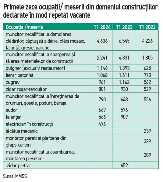 Aproape 600.000 de muncitori lucreaza, in prezent, in constructii potrivit datelor Inspectiei Muncii, institutia care gestioneaza Registrul General de Evidenta a Salariatilor (ReGES), analizate la inceputul lunii iulie 2024. Conform datelor centralizate de Agentia Nationala pentru Ocuparea Fortei de Munca (ANOFM), in primul trimestru al anului 2024, numarul locurilor de munca vacante declarate de angajatori in domeniul constructiilor era de 32.132. ANOFM poate stabili nevoia de forta de munca in anumite domenii de activitate si pentru anumite meserii pe baza situatiei locurilor de munca vacante declarate de angajatori la agentiile locale pentru ocuparea fortei de munca, in termen de 5 zile lucratoare de la vacantare, asa cum prevede legislatia. Astfel, o dimensiune mai exacta a nevoii de forta de munca din economie, de la un moment dat, este data de indicatorul "locuri de munca vacante declarate in mod repetat de angajatori", locuri de munca care nu pot fi ocupate. Deficitul de forta de munca in constructii se inregistreaza cu precadere pentru ocupatiile de muncitori necalificati, dar si pentru ocupatii care necesita calificare, precum: dulgher, fierar betonist, zugrav, zidar - rosar - tencuitor, sudor, faiantar, electrician in constructii, lacatus mecanic, zidar pietrar, potrivit datelor Ministerului Muncii si Solidaritatii Sociale (MMSS). Pentru acoperirea deficitului de munca in domeniul constructiilor, dar nu numai, se aplica masuri de stimulare a ocuparii, care se adreseaza atat angajatorilor, cat si persoanelor aflate in cautare de loc de munca. De asemenea, ANOFM sustine incadrarea persoanelor/ somerilor care apartin unor categorii vulnerabile pe piata muncii, precum absolventi de invatamant (care nu au experienta in munca), tineri NEET, persoane cu handicap, persoane cu varsta peste 45 de ani, inclusiv cei care mai au pana la 5 ani pana la indeplinirea conditiilor legale de pensionare, someri unici sustinatori ai familiilor monoparentale, tineri cu risc de marginalizare sociala.