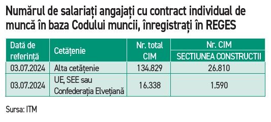 Conform datelor primite de la Inspectia Muncii, la data de 3 iulie 2024 in Romania erau angajati, in total, 151.167 lucratori straini, din care 28.400 desfasurau activitati in sectorul de constructii.