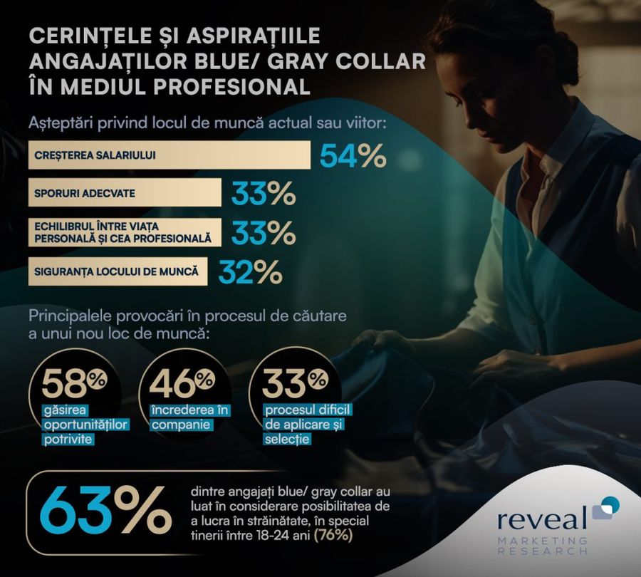 "Cresterea asteptarilor salariale este unul dintre aspectele cele mai vizibile in ultimii ani, fapt ce a amplificat si mobilitatea profesionala. Daca in trecut, se punea mai mult accentul pe pregatirea si instruirea profesionala, acum prioritatea principala este obtinerea unui salariu mai mare. Acest aspect poate fi atribuit cresterii costurilor de trai si unei constientizari mai mari a valorii angajatilor pe piata muncii. Asadar, pe fondul anxietatilor in crestere, asteptarile si nevoile angajatilor din categoria blue/ grey collar de la un loc de munca sunt in prezent definite de notiunile de siguranta, incredere si seriozitate" mentioneaza Marius Luican, CEO al Reveal Marketing Research.