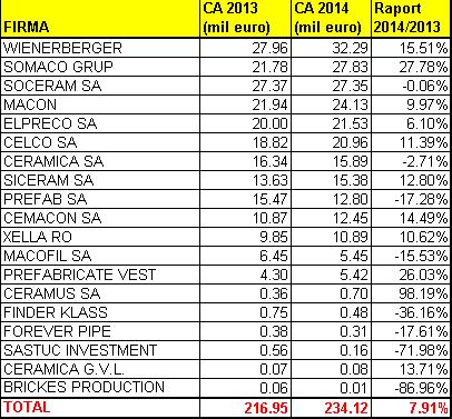 Vanzarile de pe piata locala a materialelor pentru zidarie (caramida si BCA) au inregistrat o crestere medie de circa 3%, context in care sectorul a ajuns la maximum 150 milioane de euro, fata de nivelul de 140 milioane de euro consemnat in 2013. Cele doua segmente (blocurile ceramice si din BCA) si-au continuat, insa, evolutia in mod diferit. Astfel, daca producatorii de caramida au inregistrat evolutii medii de 3%-5% ale cifrelor de afaceri, situatia de pe piata de BCA a fost putin mai buna, cei mai multi operatori din domeniu indicand evolutii medii de 7% ale vanzarilor specifice. Pentru 2015, competitorii de pe ambele piete estimeaza evolutii usoare, de maximum 5%. Din punct de vedere cantitativ, piata locala de blocuri ceramice s-a situat, la finele anului 2014, la aproximativ doua milioane de metri cubi, in crestere cu 3% fata de 2013, nivel corespunzator unei valori de 69 milioane de euro, in timp ce segmentul blocurilor din BCA s-a majorat cu 5%, pana la 2,1 milioane mc.In continuare, principala dificultate a competitorilor de pe piata blocurilor din BCA este reprezentata de "lupta" dusa la nivelul preturilor de vanzare, fara niciun castigator, insa. Preturile sunt influentate negativ de costul gazelor naturale, care s-a dublat in ultimii doi ani, nivelul actual al acestora ducand la scaderea competitivitatii intregii industrii a materialelor de constructii din Romania. In pofida faptului ca producatorii aloca bugete pentru investitii majore in ceea ce priveste eficienta energetica, cresterea costurilor astfel rezultate nu poate fi transferata clientilor, intrucat acestia vor prefera produse fabricate in alte tari, iar mari unitati de productie vor fi nevoite sa-si reduca sau chiar inchida capacitatile. O influenta deosebit de negativa o au, de asemenea, cresterile preturilor de distributie stabilite de ANRE, care sunt foarte mari pentru consumatorii industriali si creeaza profituri nejustificate distribuitorilor de gaze naturale, motiv pentru care multe fabrici sunt captive.