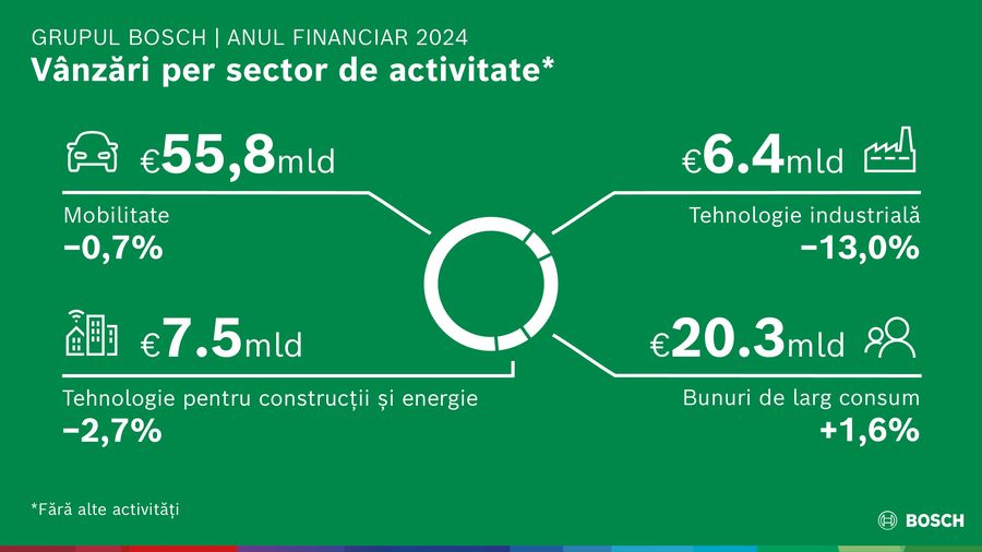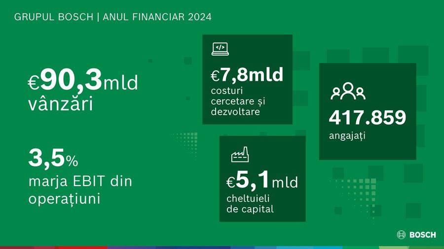Grupul Bosch isi continua ambitioasa strategie pentru 2030, de a-si consolida pozitia competitiva, chiar daca mediul din piata a constituit anul precedent o frana semnificativa a cresterii: cu 90,3 miliarde de euro, furnizorul de tehnologie si servicii a generat in 2024 venituri din vanzari cu 1,4 procente mai putin decat in anul precedent, sau cu 0,5 procente mai putin dupa ajustarea efectelor cursului de schimb. EBIT (venituri inainte de dobanzi si taxe) din operatiuni a fost de 3,1 miliarde de euro (2023: 4,8 miliarde de euro); marja operationala EBIT a fost de 3,5 procente. Referindu-se la prezentarea cifrelor anuale ale companiei, Stefan Hartung, presedintele consiliului de administratie al Robert Bosch GmbH, a declarat: „In anul fiscal 2024 am realizat imbunatatiri importante in ceea ce priveste costurile, structurile si portofoliul. Ne mentinem obiectivele ambitioase pentru a continua sa crestem si sa ne consolidam independenta financiara. Strategia noastra pentru 2030 ne ofera orientarea de care avem nevoie, in special in vremuri de turbulente globale, pentru a deveni unul dintre primii trei furnizori de pe pietele noastre principale, in cel mult cinci ani.”Strategia corporativa se reflecta si in obiectivele financiare ale Bosch: in conditiile unei rate normale a inflatiei cuprinsa intre 2 si 3 procente, Bosch isi propune sa atinga in medie o crestere anuala intre 6 si 8 procente pana in 2030. In primul trimestru al anului 2025, Bosch si-a marit cifra veniturilor din vanzari cu 4 procente fata de anul precedent, atat in euro, cat si ajustate pentru efectele cursului de schimb. Grupul Bosch urmareste in continuare o marja tinta de 7 procente in 2026. Hartung considera ca acest lucru constituie o sarcina extrem de provocatoare, avand in vedere conflictele globale si, mai ales, concurenta semnificativ mai puternica din Asia: "Vom continua sa lucram intens la costurile si structurile noastre si ne vom concentra pe zonele de afaceri profitabile”. Bosch a anuntat deja ajustari structurale si reduceri de locuri de munca in diverse domenii, cu scopul de a consolida competitivitatea companiei. Bosch este in contact cu reprezentantii angajatilor si ii indeamna sa ajunga rapid la un acord si sa inceapa procesul de implementare. „Numai atunci vom putea profita de oportunitatile dintr-un mediu de piata dinamic, inclusiv de cele care apar brusc. Nu ne mai putem permite intarzieri, deoarece acest lucru ne-ar slabi si mai mult pozitia competitiva.” In general, Bosch preconizeaza ca numarul de locuri de munca din companie va continua sa scada, in special in Germania si Europa.